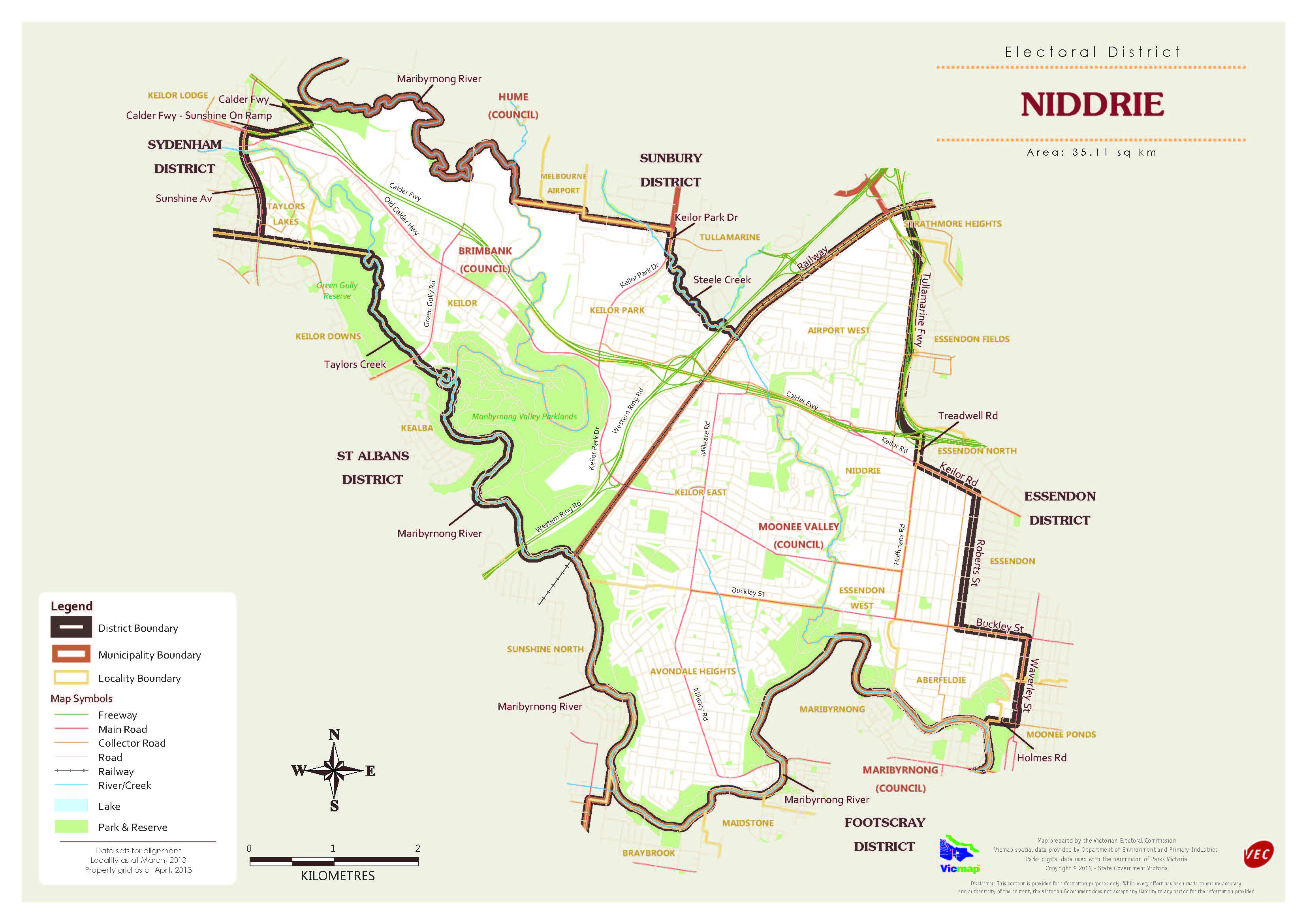 The Niddrie District covers an area of 35 square kilometres (14 sq mi), including the suburbs of Aberfeldie, Airport West, Avondale Heights, Essendon West, Keilor, Keilor East, Keilor Park and Niddrie and parts of the suburbs of Essendon and Taylors Lakes.